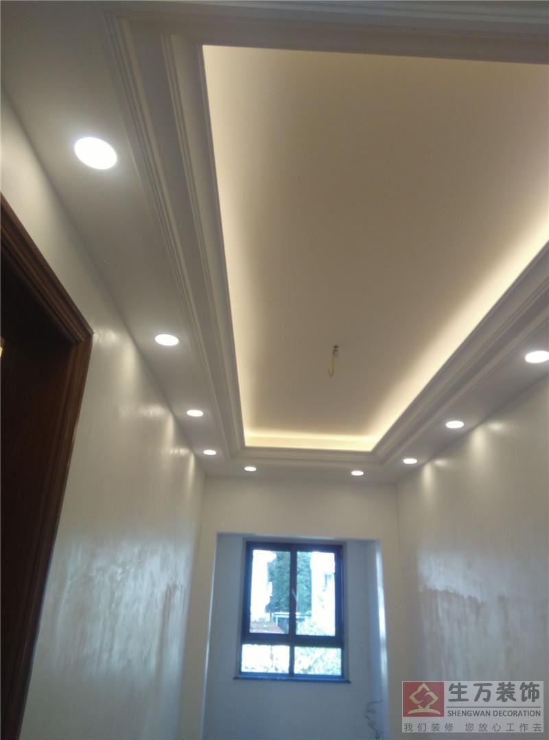 二层主人房衣帽间天花吊顶。墙面已经全部铺贴环保墙纸。