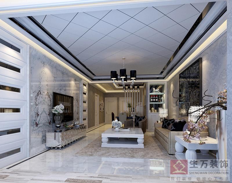 客厅顶面采用了欧式木格装饰,电视背景干挂大理石,空间无比大气。