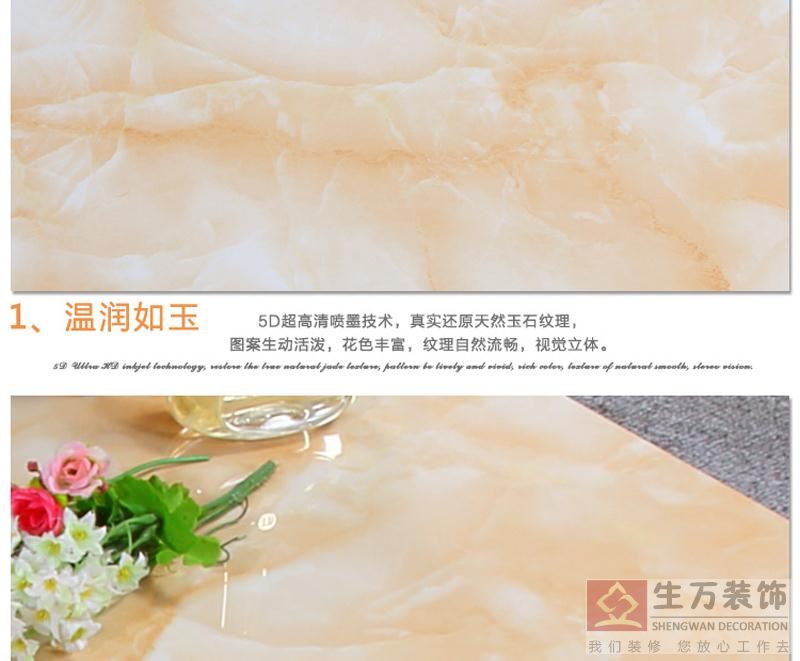 2、其釉料特点是透明不遮盖底下的面釉和各道花釉,抛釉时只抛掉透明釉的薄薄一层,而透明凸状花釉作全抛釉是唯美陶瓷马可波罗的杰出之作,其凸釉通过丝网印花于砖面成间断的凸粒状釉,烧成再抛釉,效果更是别具一格。