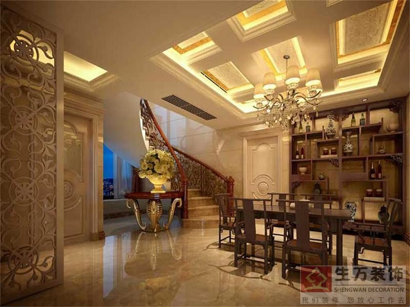 餐厅装修,1.5米石材餐台,红木色的酒水柜,欧式的天花造型,与餐厅形成上下相呼应,空间更为舒适。